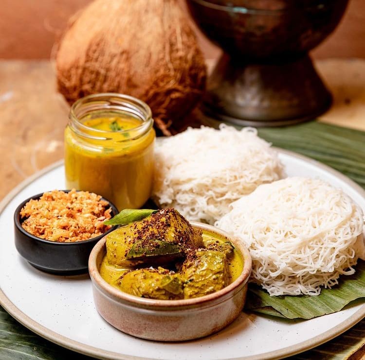 Locals call string hoppers “Idi Appa”, and this is a popular breakfast and dinner meal. String hoppers are made of rice flour, the dough is inserted into a device and then applied pressure from the hand to make thin strings that are flat and round. Then they are steamed and usually served with dhal curry and pol sambol.