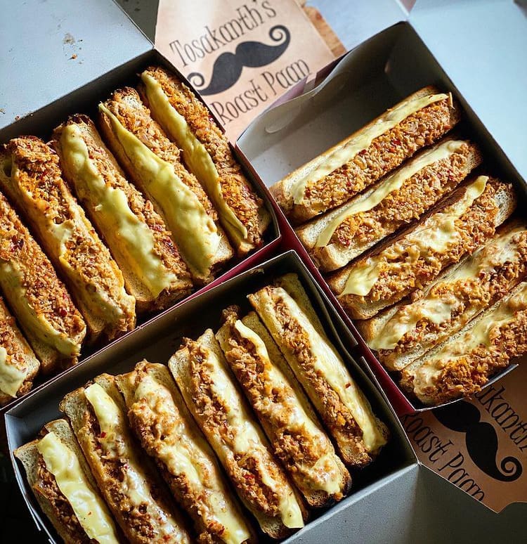 Roast Paan is served with dhal curry and coconut sambol in most places. But you can also try it with chicken curry, fish curry or seeni sambol.