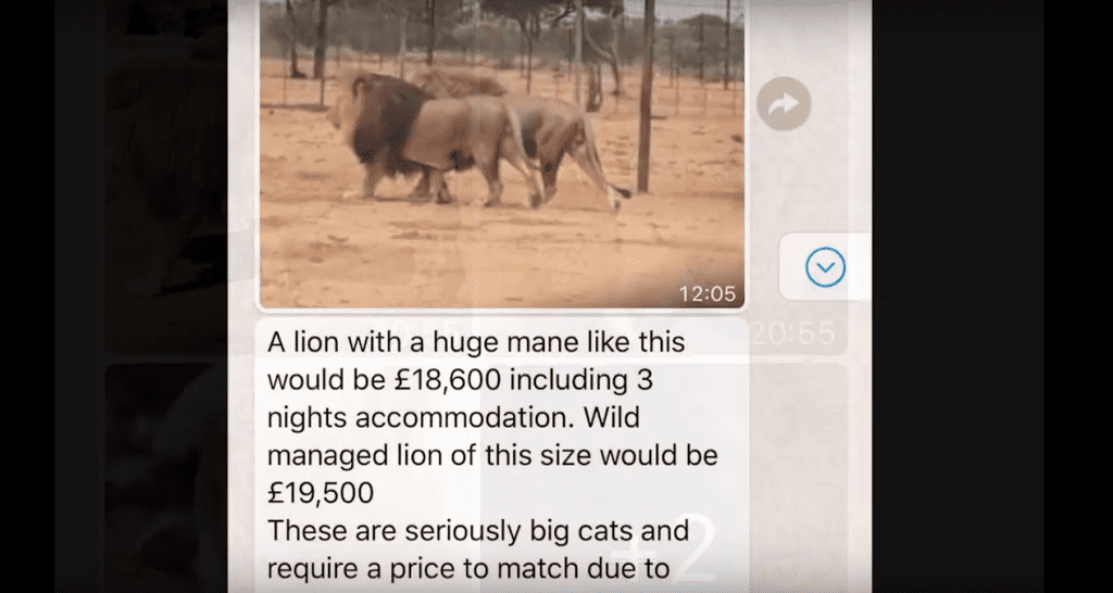 - Wealthy potential hunters are sent images of captive male lions via WhatsApp. Out of which they are able to make a choice as to which they’d like to kill. Prices range from £10k to over £42k ($12k-$52k), depending on the size of the lion and the quality of its mane.