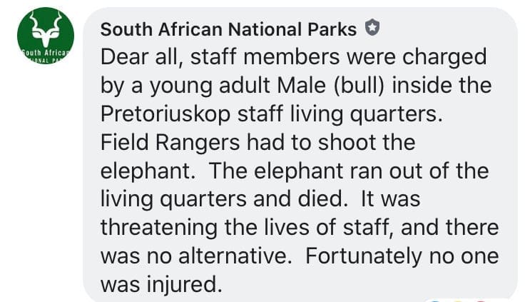 SANParks released a statement confirming the tragic incident. They explained that shooting the bull was the last resort and rangers were left with no choice, as the elephant was endangering lives of staff. They also added that after being shot, the elephant ran out of the living quarters and died.