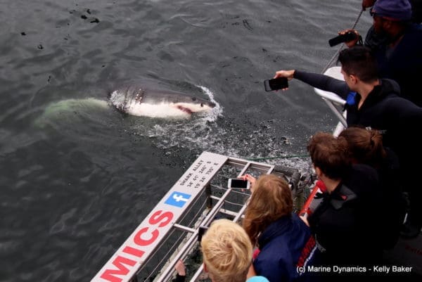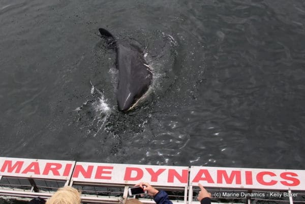 “A surprise was lurking in the bay for the Marine Dynamics team and guests today in the form of a stunning Great White shark. This happened to be a very well known shark in the Gansbaai area going by the nickname Mini Nemo. This male is one we have documented yearly since 2012,