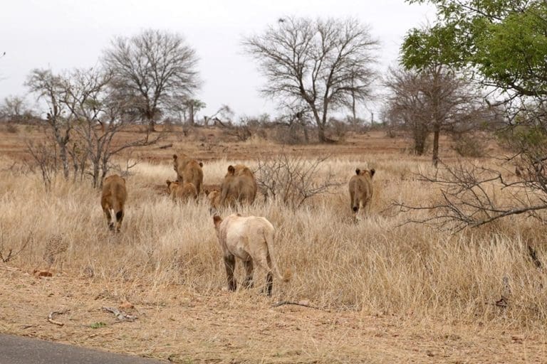‘We saw the pride at the waterhole when we were there, but they had a quick drink and were gone, early the next morning as we left to go back down to Hazyview we were ecstatic to see some of the pride walking down the road towards us! They seemed to be on a mission to get somewhere because they didn’t stick around but it was worth every breathtaking minute.’