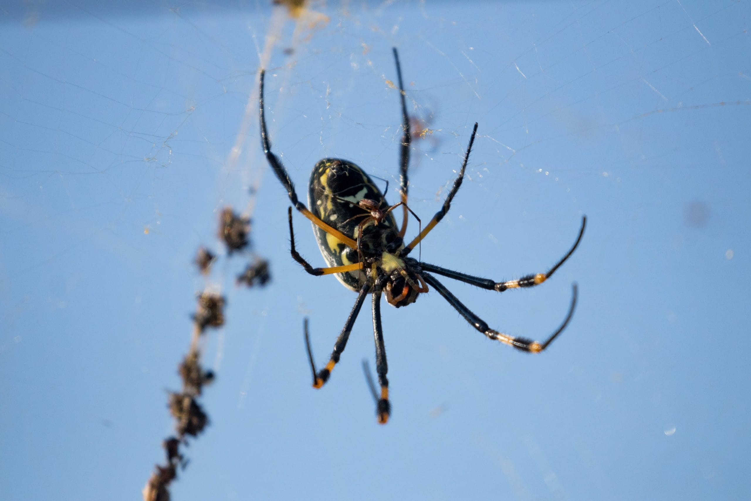 Sunlight catching on the characteristic yellow silk of a female’s web as she perches in the centre waiting for her next victim © Sophie Barrett